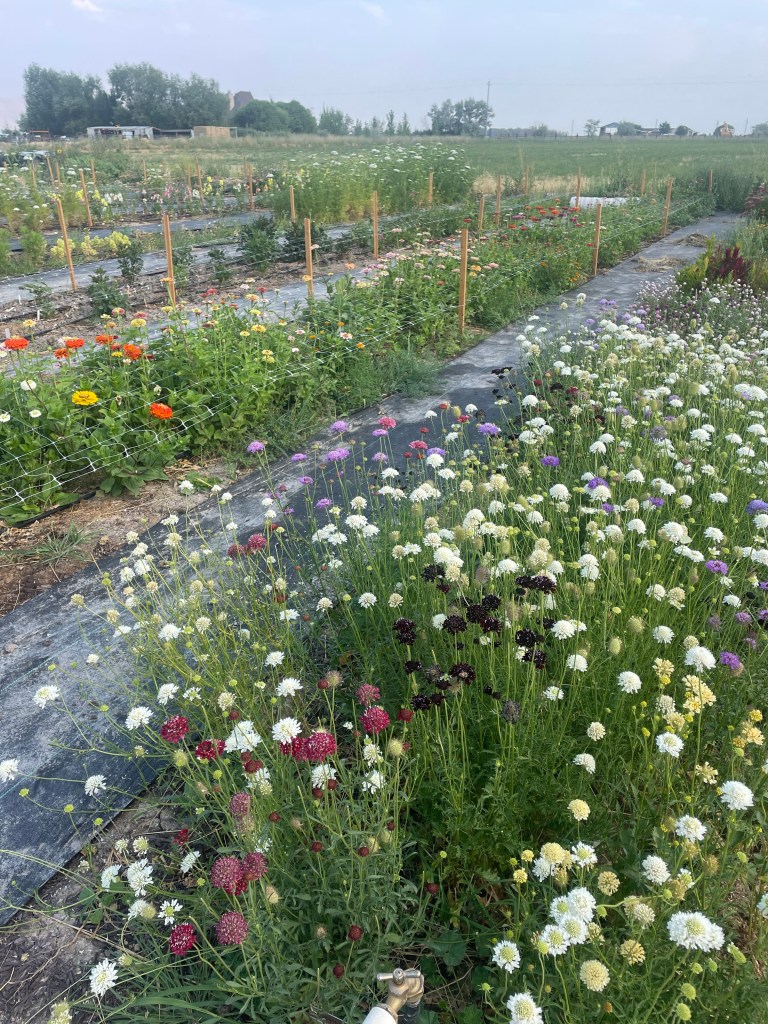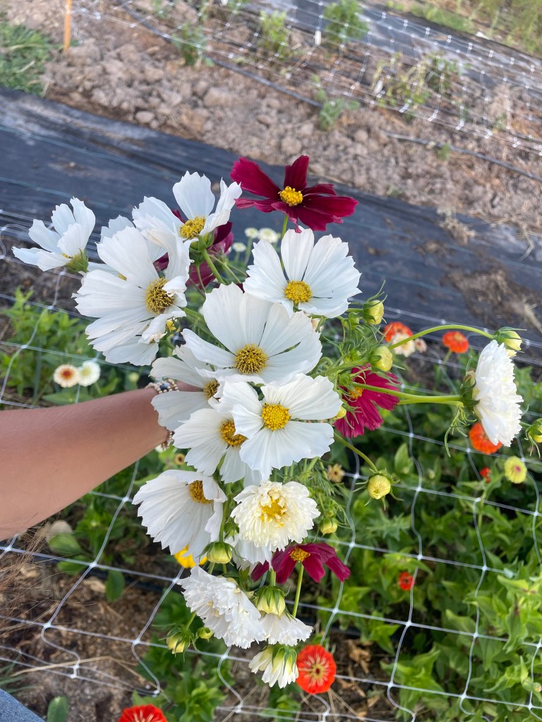 We have several cosmo varieties. including your classic white cosmos, double cosmos, maroon, and peach. These are perfect to achieve the “wild flower” look.