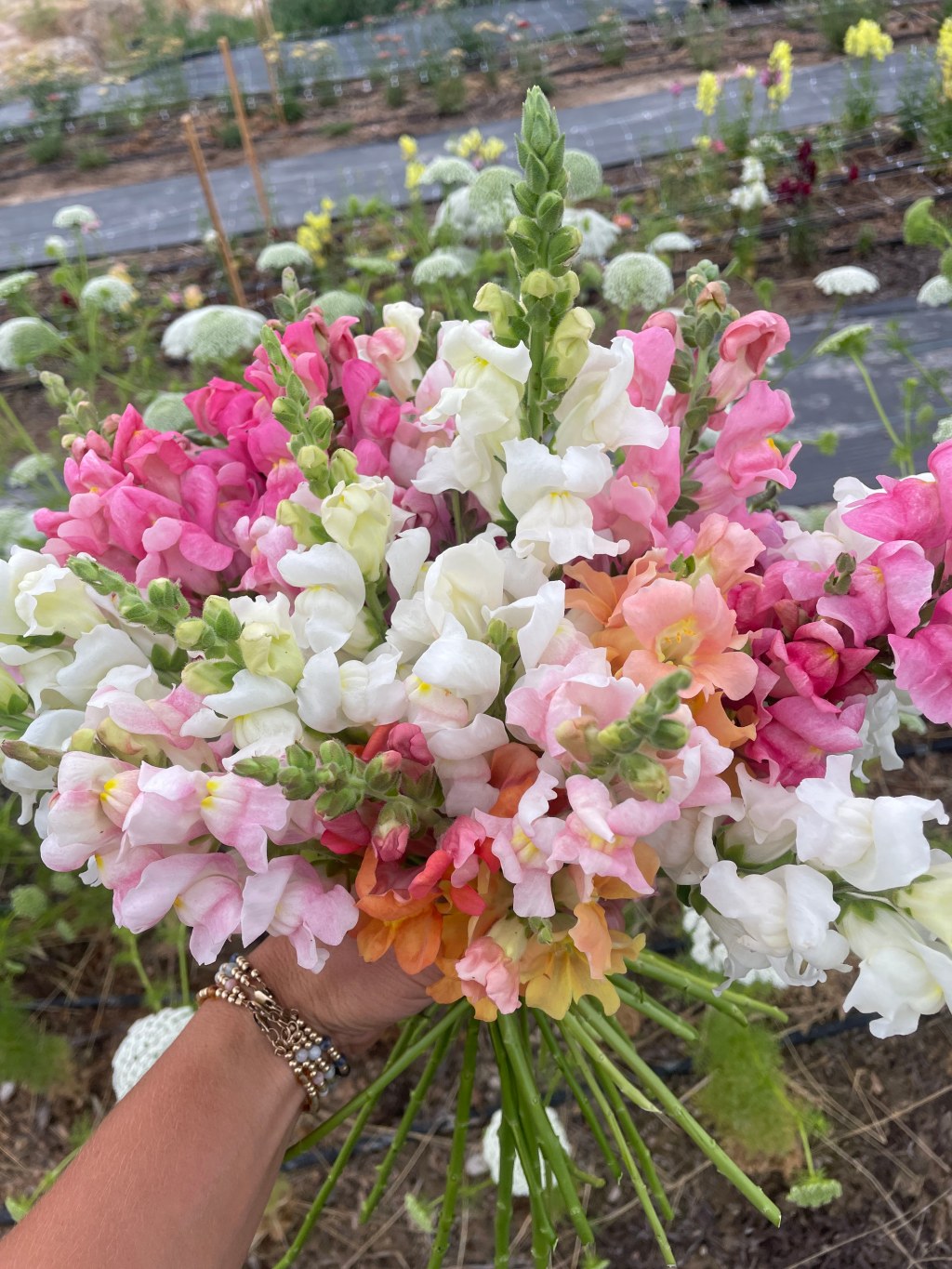 We have a variety of colored snapdragons. From white, peach, light pink, dark pink, red and yellow.