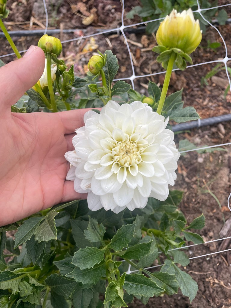 This is a soft white dahlia. Medium-large size.