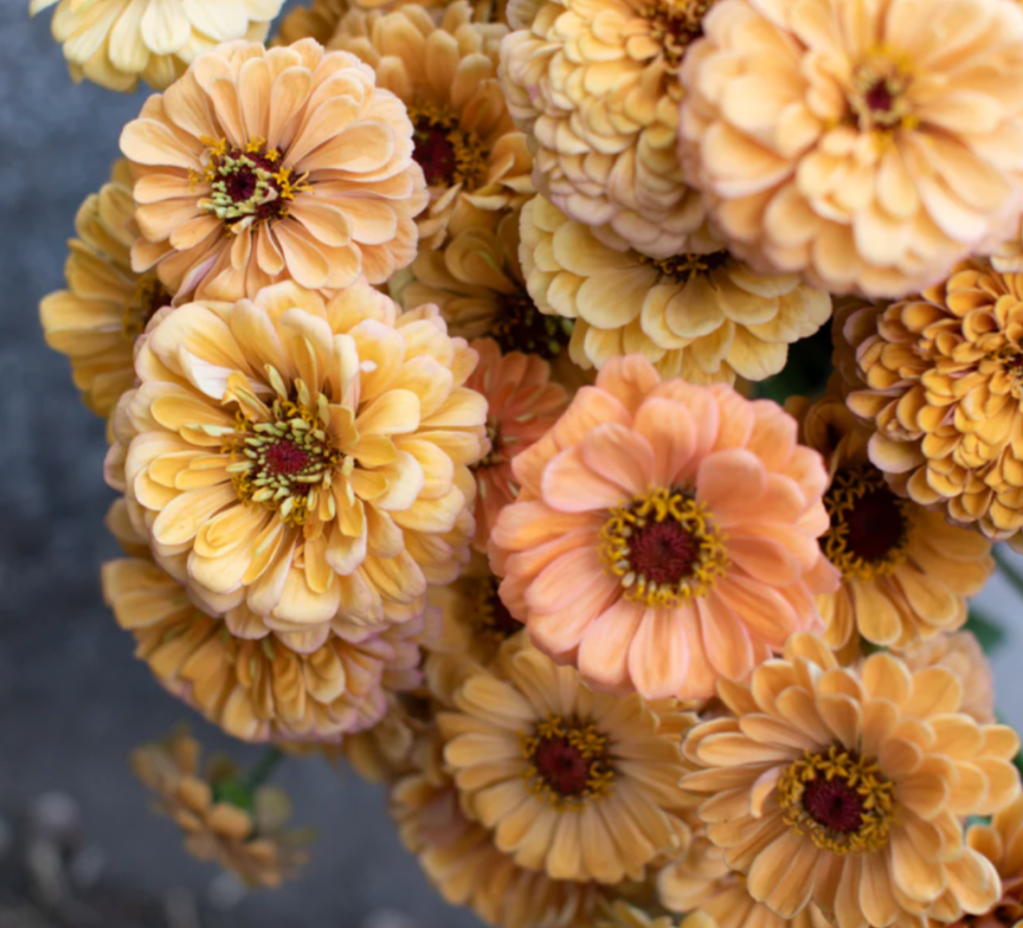 A floret original. Petite blooms ranging in the colors of buff, pale peach, rose-pink, blush, and the occasional soft orange.